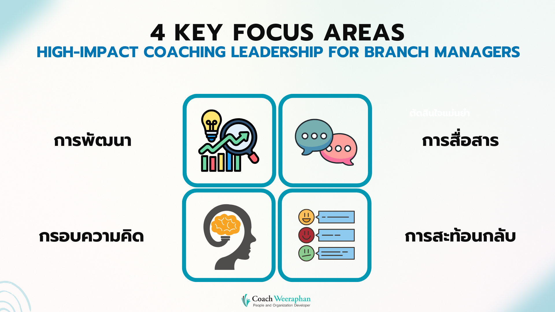 หัวใจของหลักสูตรนี้คือ การพัฒนาผู้จัดการสาขาให้เข้าใจบทบาทใหม่ของผู้นำยุคปัจจุบัน ที่ไม่ใช่เพียงการควบคุมงานหรือผลักดันตัวเลข แต่คือการ “สร้างคนให้เติบโต” ผ่านทักษะการโค้ชและการพัฒนาคนที่ใช้ได้จริงในสถานการณ์ของสาขาที่ต้องทำงานอย่างต่อเนื่องทุกวัน เนื้อหาถูกออกแบบเพื่อเสริมทั้งกรอบความคิด ทักษะ และเครื่องมือที่ช่วยให้ผู้นำสามารถเปิดพื้นที่ปลอดภัยในการสื่อสาร ตั้งคำถามอย่างทรงพลัง กระตุ้นการคิดของทีม และสะท้อนกลับอย่างสร้างสรรค์โดยไม่ทำลายความสัมพันธ์ หรือความมั่นใจของผู้ใต้บังคับบัญชา หลักสูตรมุ่งเน้นให้ผู้เรียนเข้าใจความแตกต่างระหว่างบทบาทของ Boss, Mentor และ Coach และสามารถเลือกใช้ให้เหมาะกับระดับ Skill–Will ของทีม เพื่อให้การบริหารงานประจำวัน ผสานเข้ากับการพัฒนาคนอย่างเป็นธรรมชาติ ผู้เรียนจะได้ฝึกฝนบทสนทนาแบบ Coaching & Mentoring ผ่านโมเดล 10-Minute Coaching, CARE Model และ Feedback Framework ที่ออกแบบมาเพื่อใช้ได้จริงในงานภาคสนามและบริบทของหลายสาขาที่ต้องการความรวดเร็ว แม่นยำ และลดความคลาดเคลื่อนในการสื่อสาร อีกหนึ่งจุดมุ่งเน้นสำคัญคือการสร้างระบบการพัฒนาคนในทีมผ่าน Performance Coaching, Coaching Calendar และ Micro Action Plan เพื่อให้การเปลี่ยนแปลงพฤติกรรมเกิดขึ้นได้จริงหลังอบรม โดยเนื้อหาจะเชื่อมโยงตั้งแต่การประเมินตัวเอง การตั้งเป้าหมายรายบุคคล การติดตามผล ไปจนถึงการสร้างวัฒนธรรมการเรียนรู้ในทีมอย่างต่อเนื่อง ซึ่งเป็นหัวใจของการบริหารสาขาให้เติบโตและลดภาระของผู้จัดการในระยะยาว หลักสูตรนี้จึงไม่ใช่เพียงการเรียนรู้ทฤษฎี แต่เป็นการฝึกปฏิบัติผ่าน Workshop, Case Study และ Template เครื่องมือต่าง ๆ ที่ออกแบบให้ใช้งานได้ทันที เพื่อให้ผู้จัดการสาขาพัฒนาแนวคิดแบบผู้นำโค้ช มองเห็นศักยภาพของทีม และสร้างผลลัพธ์ที่ยั่งยืนทั้งในระดับบุคคลและระดับสาขา โดยยึดหลัก Outcome Driven Learning เพื่อให้ทุกการเรียนรู้เกิดผลลัพธ์จริงในงานของผู้นำยุคใหม่