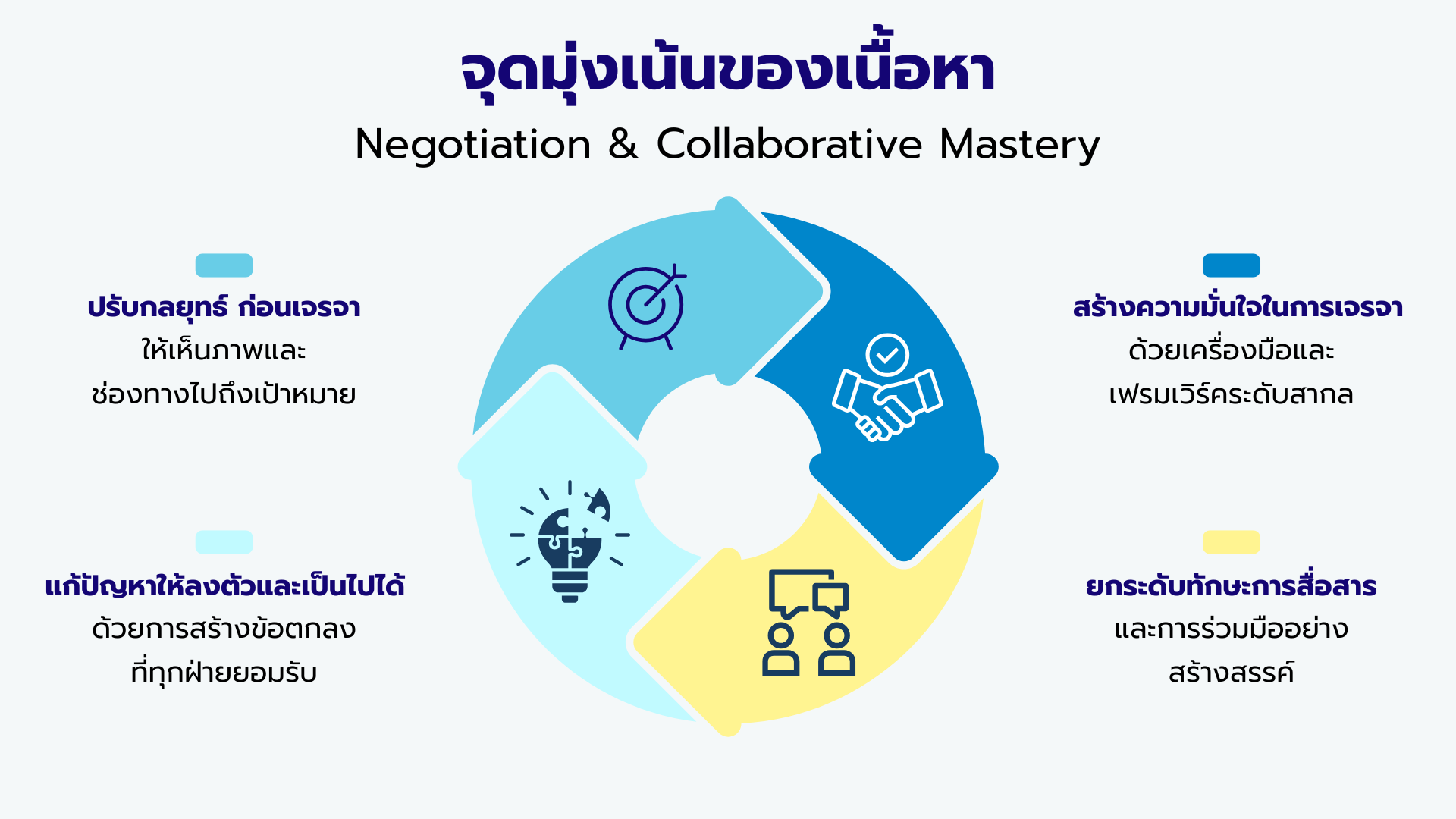 หลักสูตร Negotiation and Collaborative Mastery ถูกออกแบบให้ผู้เรียนเข้าใจอย่างลึกซึ้งว่า “การเจรจา” และ “การร่วมมือ” คือหัวใจของการทำงานยุคใหม่ที่ต้องใช้ความเข้าใจมนุษย์ การสื่อสารอย่างมีชั้นเชิง และทักษะการมองภาพรวมเชิงกลยุทธ์ หลักสูตรทั้ง 4 Parts จึงถูกวางขึ้นอย่างเป็นลำดับขั้น เพื่อพาผู้เรียนเดินทางจากความเข้าใจตนเอง ไปสู่การอ่านเกมคนอื่น การจัดการความสัมพันธ์ และการสร้างสภาพแวดล้อมแห่งความร่วมมือที่แข็งแรงและยั่งยืน Part 1 Strategic Mindset for Negotiation and Collaboration – ปรับเลนส์ความคิด เปิดมุมมองใหม่ในการเข้าใจคนและงาน Part 2: Value-based Negotiation Mastery – เจรจาแบบมืออาชีพ บนความมั่นใจและข้อมูลที่ชัดเจน Part 3: Collaborative Communication & Conflict Navigation – สื่อสารเป็น ฟังเป็น และเปลี่ยนความต่างให้เป็นพลังทีม Part 4: Collaborative Problem-Solving & High-Impact Agreements – สร้างข้อตกลงที่นำไปสู่การลงมือทำจริง หลักสูตร Negotiation and Collaborative Mastery ไม่ได้สอนแค่ “พูดอย่างไรให้ชนะ” แต่สอนให้ทีม “เข้าใจกันอย่างลึกซึ้งจนชนะไปด้วยกัน” ผู้เรียนจะออกจากหลักสูตรด้วยความมั่นใจที่มากขึ้น มุมมองที่กว้างขึ้น และทักษะที่พร้อมใช้จริงในการเจรจา ประสานงาน และสร้างความร่วมมือที่เกิดผลลัพธ์ทางธุรกิจอย่างแท้จริง