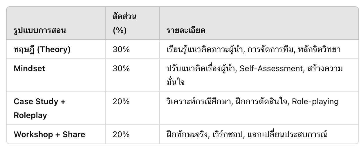 - ฝึกฝนทักษะผ่าน Workshop, Role-Playing และ Case Study