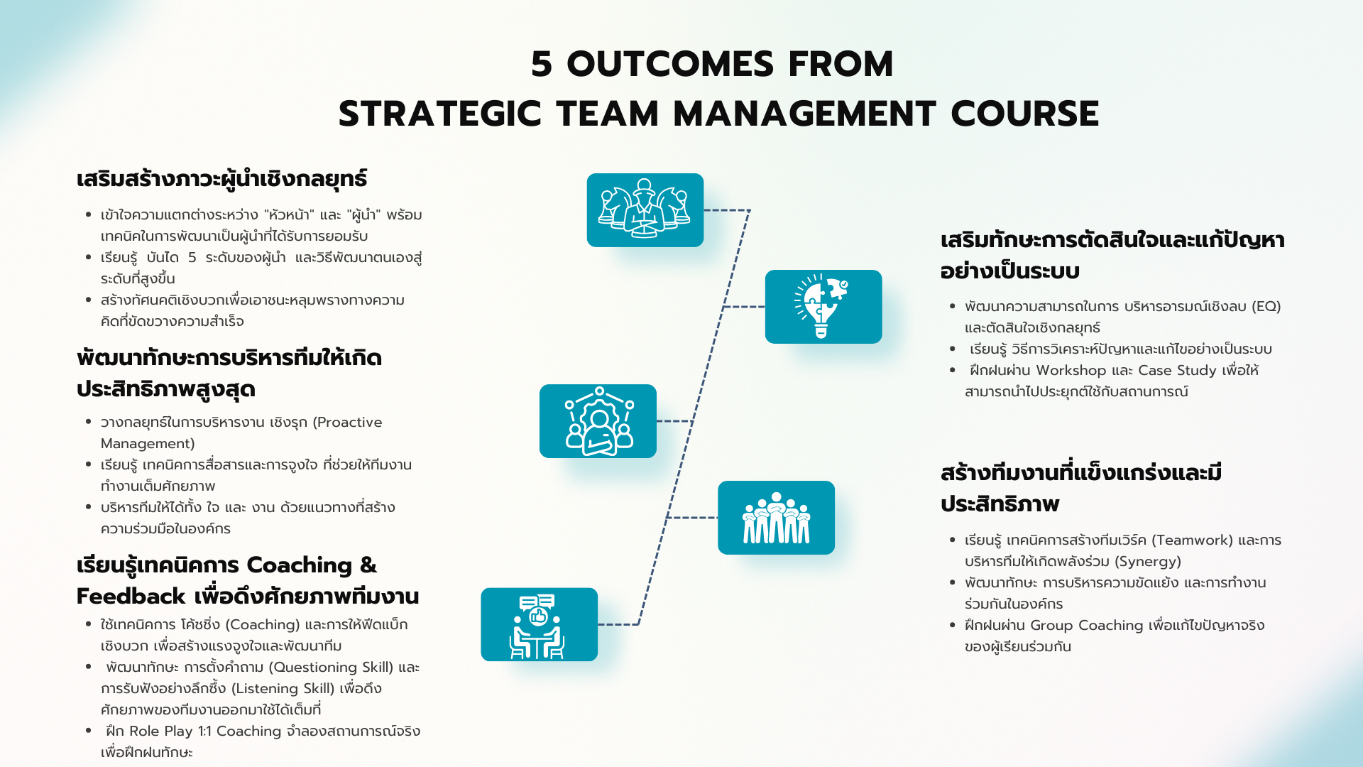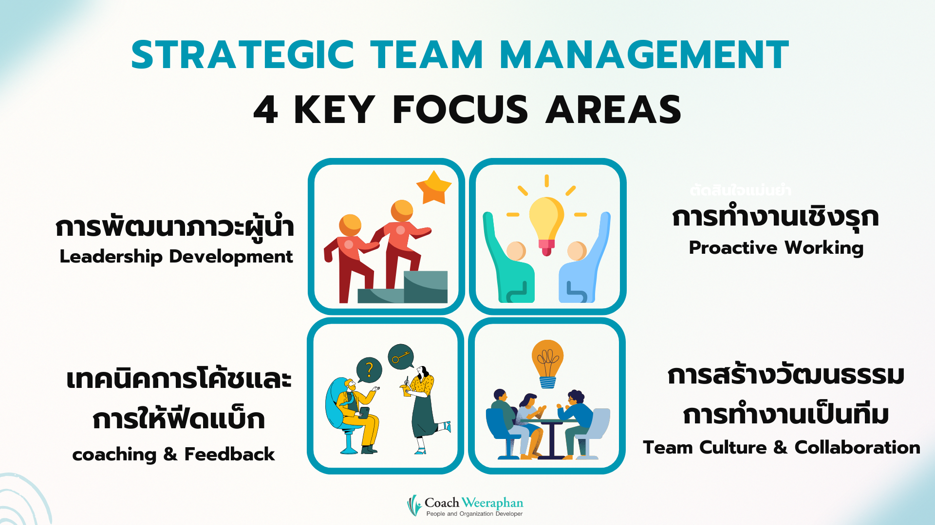 หลักสูตร การบริหารทีมงานเชิงกลยุทธ์ (Strategic Team Management) ได้รับการออกแบบเพื่อพัฒนาทักษะและกรอบความคิดของหัวหน้างานและผู้จัดการ ให้สามารถบริหารทีมงานอย่างมีประสิทธิภาพสูงสุด ผ่านการทำงานเชิงรุก การเป็นผู้นำที่ทรงพลัง และการใช้ Coaching & Feedback เพื่อสร้างแรงจูงใจและพัฒนาทีมงานให้มีศักยภาพสูงสุด เสริมสร้างภาวะผู้นำเชิงกลยุทธ์ การบริหารทีมงานเชิงกลยุทธ์, พัฒนาภาวะผู้นำ (Leadership Development), หลักสูตรการบริหารทีมสำหรับผู้จัดการ, Coaching & Feedback เพื่อพัฒนาทีมงาน, เทคนิคการบริหารทีมเวิร์ค (Teamwork Management), การสร้างแรงจูงใจและการสื่อสารในทีม, การบริหารงานเชิงรุก (Proactive Team Management), อบรมพัฒนาหัวหน้างานและผู้จัดการ, ฝึกอบรมภาวะผู้นำ (Leadership Training), การโค้ชทีมงานอย่างมีประสิทธิภาพ, กลยุทธ์บริหารทีมให้ได้ทั้งใจและงาน, เทคนิคการให้ฟีดแบ็กเชิงบวก (Positive Feedback), หลักสูตรพัฒนาทักษะหัวหน้างาน, สร้างทีมเวิร์คให้มีประสิทธิภาพสูงสุด, วิธีการบริหารทีมงานให้เกิดผลลัพธ์